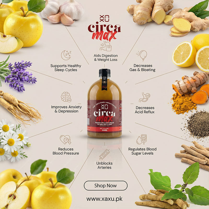 Circa Max is an all-in-one wellness blend formulated with apple cider vinegar, herbs, and adaptogens to support digestion, metabolism, sugar balance, stress management, sleep, and heart health—naturally and safely for daily use.